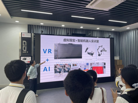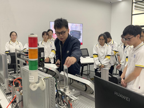 活动首站聚焦智能制造领域实践。广东工业大学实训中心教师以“圆饼型毛坯件加工指尖陀螺”为典型案例,系统展示了从设计到成品的自动化产线流程;结合可编程逻辑控制器(PLC)原理讲解,为学生展示毛坯件加工全流程操作,并现场演示PLC在产线调度中的核心作用。在虚拟现实+智能机器人实训室,学生们观摩了基于AI模型训练的机械臂分拣系统,直观感受智能技术对传统制造业的赋能效应。