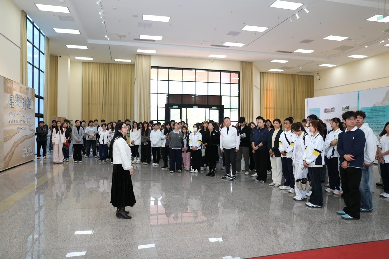 在“星湖潋滟”艺术作品展现场,一幅幅兼具思想性与艺术性的作品吸引师生驻足。画作、摄影、书法等多元艺术形式,生动再现了肇庆星湖70年来从生态保护到综合治理、从景观打造到文旅融合的发展历程。大家结合专业知识,细致探讨星湖在湿地保护、水资源治理、生态修复等方面的实践经验,深刻认识到“绿水青山就是金山银山”的发展理念在地方治理中的生动实践;从作品的艺术表达、文化传播角度,分析星湖文化如何通过艺术形式走进大众视野,为地方文旅发展赋能。师生们纷纷表示,此次参观让专业学习与生态保护、地方发展紧密结合,进一步明确了青年党员在生态文明建设中的责任担当。