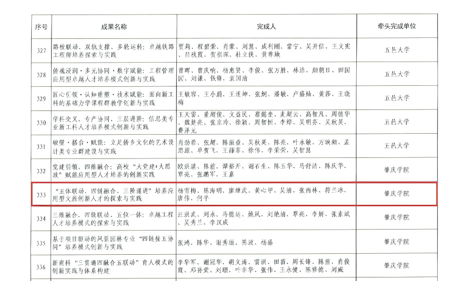 近日,广东省教育厅公布2025年全省学校优秀教学成果奖(高等教育本科类、研究生类)获奖名单,我院杨雪梅、陈海明、廖继武等9位老师牵头完成的《“五体联动、四链融合、三阶递进”培养应用型文旅创新人才的探索与实践》,喜获高等教育本科类二等奖。该成果历经十年打磨,精准破解文旅人才培养核心痛点,构建起特色鲜明的应用型人才培养体系,是我院旅游管理学科建设、教学改革及深化产教融合的重要标志性成果。