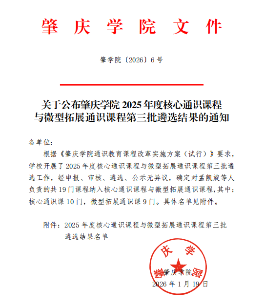 近日,在肇庆学院2025年度核心通识课程及核心微型拓展通识课程认定工作中,我院教师凭借扎实的教学功底、优质的课程设计与鲜明的教学特色斩获佳绩,多门课程成功入选,入选数量占全校获评总数的三分之一,彰显了我院在通识课程建设领域的强劲实力与突出成效!