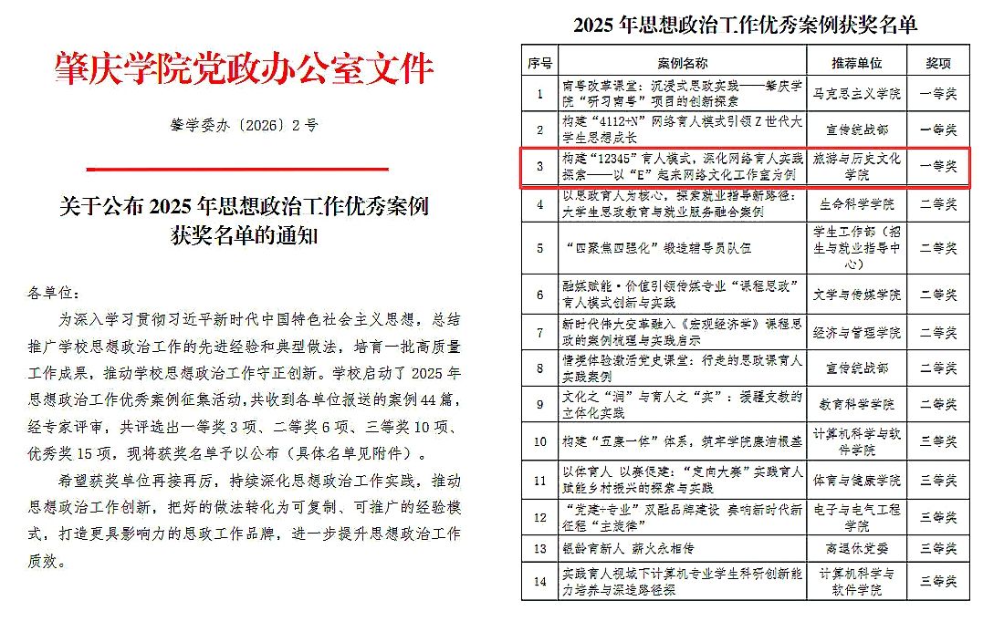 近日,肇庆学院 2025 年思想政治工作优秀案例评选结果揭晓,我院车翔宇老师报送的《构建 “12345” 育人模式,深化网络育人实践探索 —— 以 “E” 起来网络文化工作室为例》荣获一等奖。