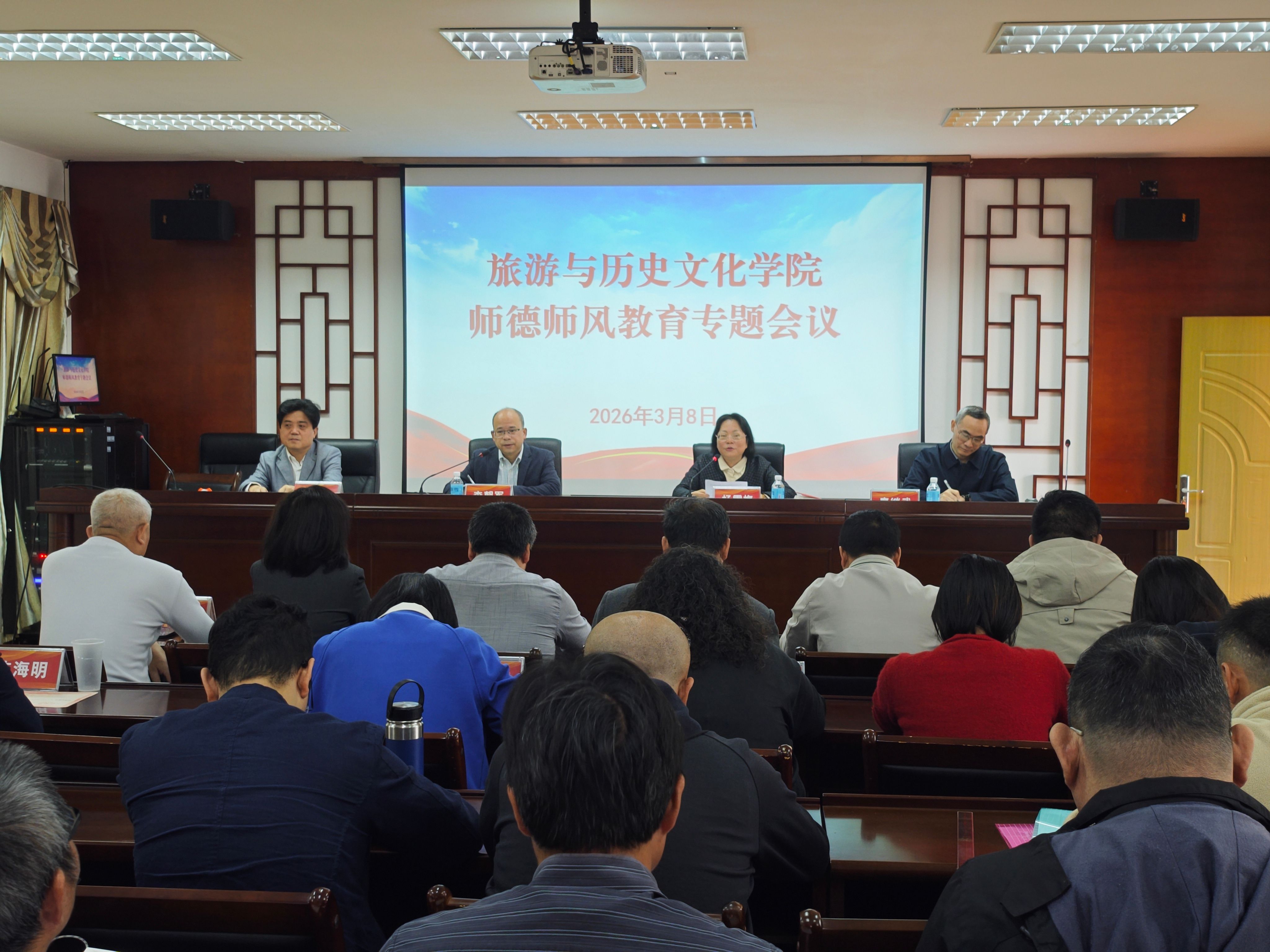 为深入贯彻落实党的二十大精神和习近平总书记关于教育的重要论述,全面加强新时代高校教师师德师风建设,落实立德树人根本任务,3月8日,旅游学院组织全体教师开展2026年师德师风专题教育。党委书记杨雪梅主持,李朝军院长、廖继武副院长、王灿副院长以及系部主任、全体教师参加。