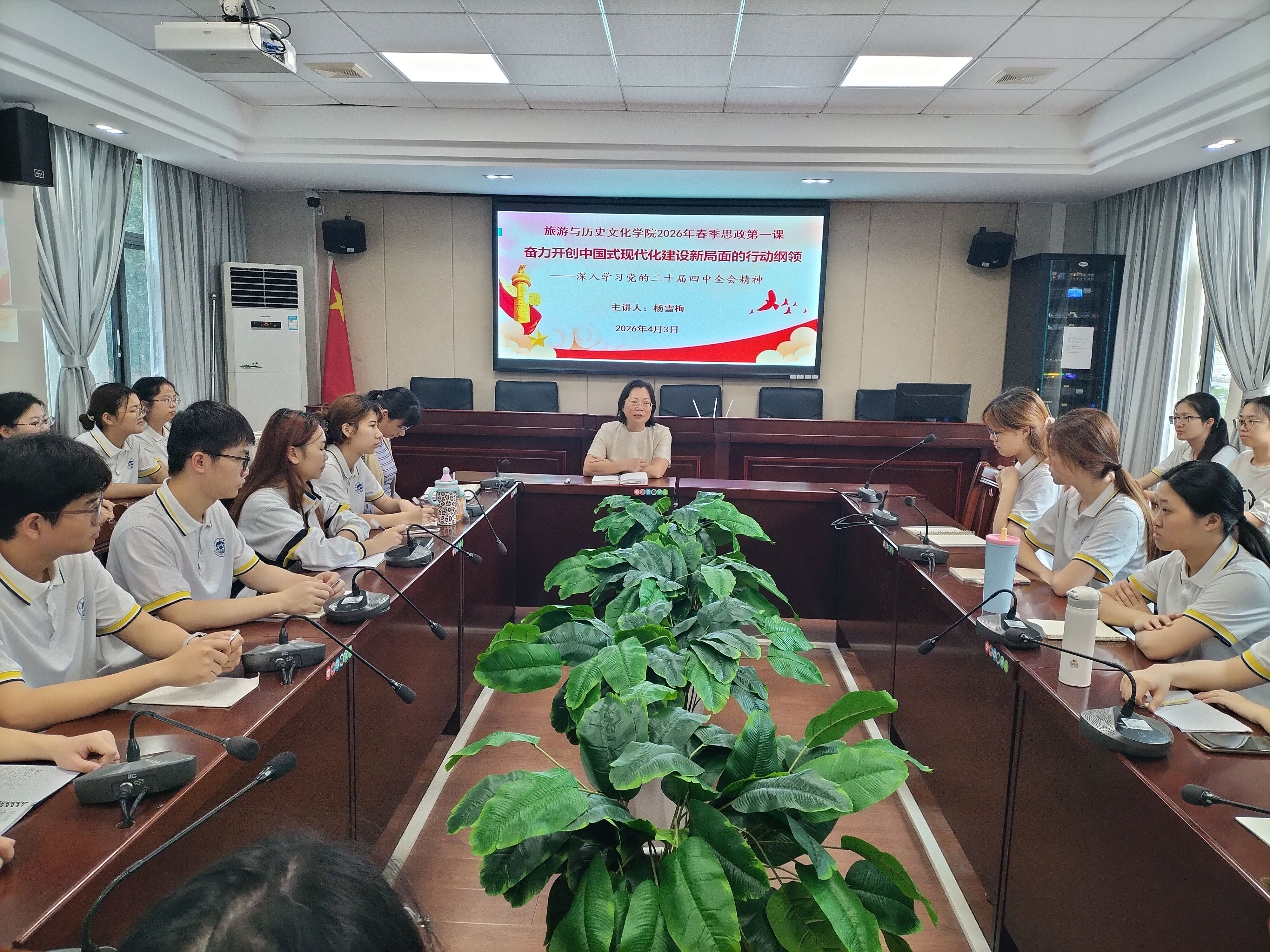 为深入学习宣传贯彻党的二十届四中全会精神,引导广大青年学生深刻领会中国式现代化的核心要义与实践要求,4月3日,旅游与历史文化学院党委书记 杨雪梅以《奋力开创中国式现代化建设新局面的行动纲领——深入学习党的二十届四中全会精神》为题,为学院青年学生讲授了一堂思政第一课。学院辅导员代表与2024级学生代表近40人共同聆听了本次授课。