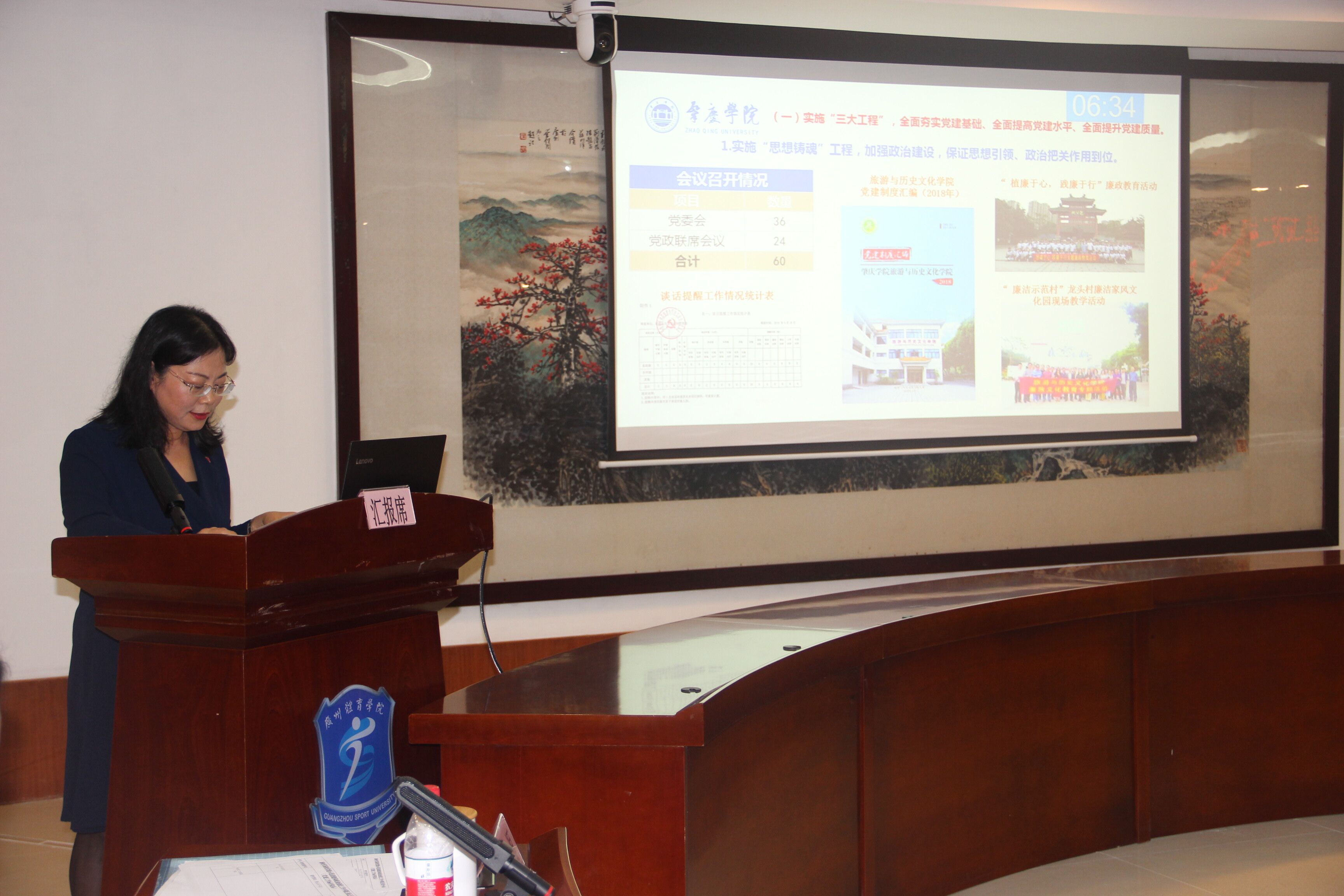 在汇报中,杨雪梅书记根据学院党委把本年度确定为“党建工作质量年”的工作实际,主要从两方面进行了汇报:一是实施“三大工程”,全面夯实党建基础、全面提高党建水平、全面提升党建质量;二是积极构建“一体十联”融合式党建新格局,全力提升应用型人才培养质量。一年来,学院党委不断健全和完善党组织建设的规范性制度、激励性制度和保障性制度,全面推动学院基层党组织的规范化建设。